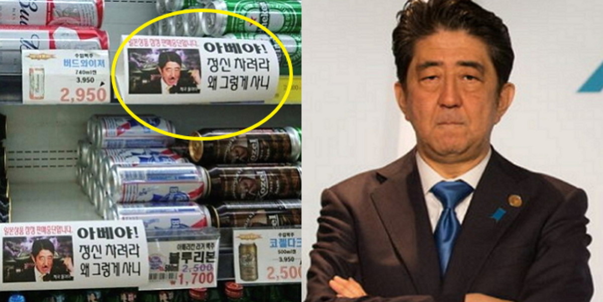 대신 이들 맥주가 있어야 할 자리에는 "아베야! 정신 차려라. 왜 그렇게 사니"라는 문구와 우스꽝스러운 아베의 사진이 붙어있다.
