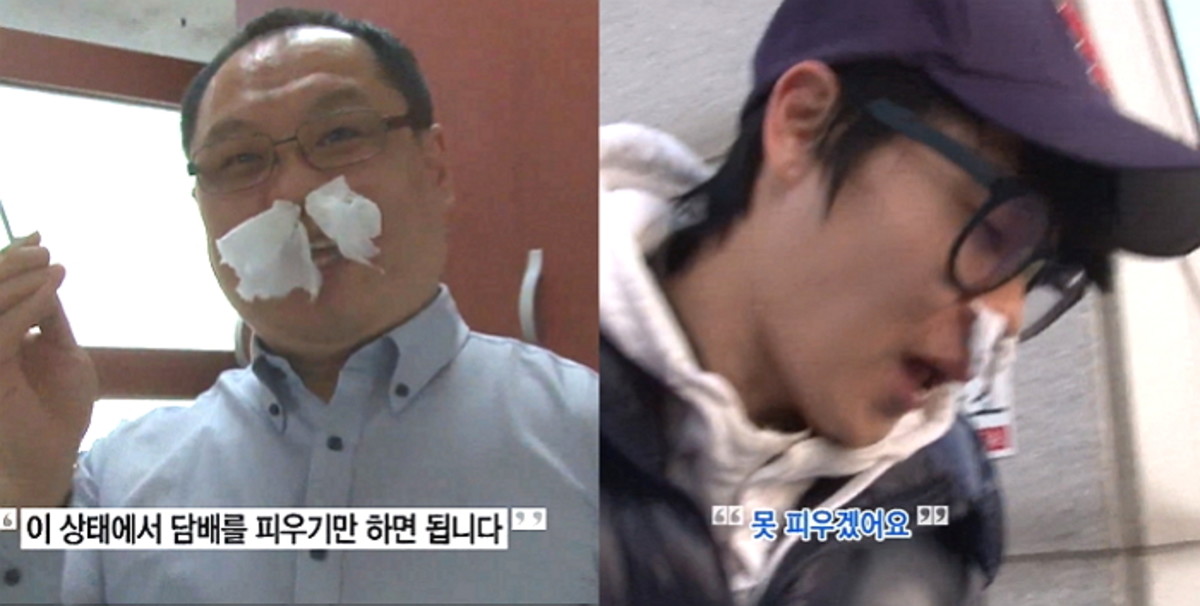 이후 휴지를 돌돌 말아 콧구멍 양쪽을 막고 평소처럼 담배를 피운다.