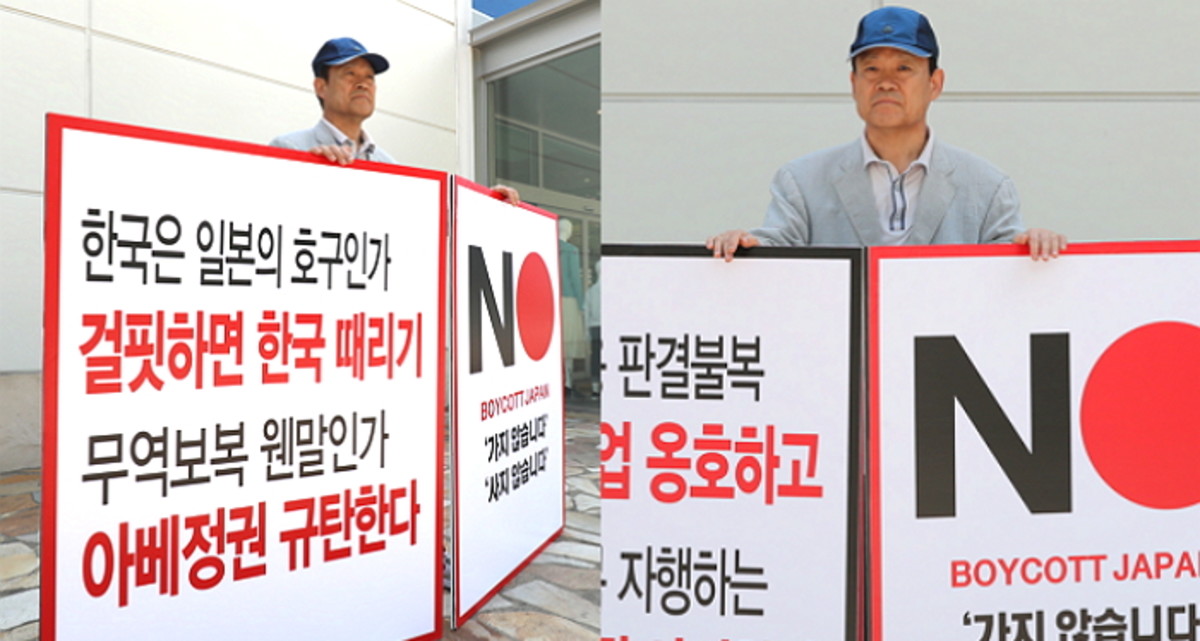 일본 기업 불매 운동에 동참하고자 유니클로 매장 앞에 '가지 않습니다, 사진 않습니다'가 적힌 패널을 들고 선 이들 중에는 올해 74살의 할아버지도 있었다.