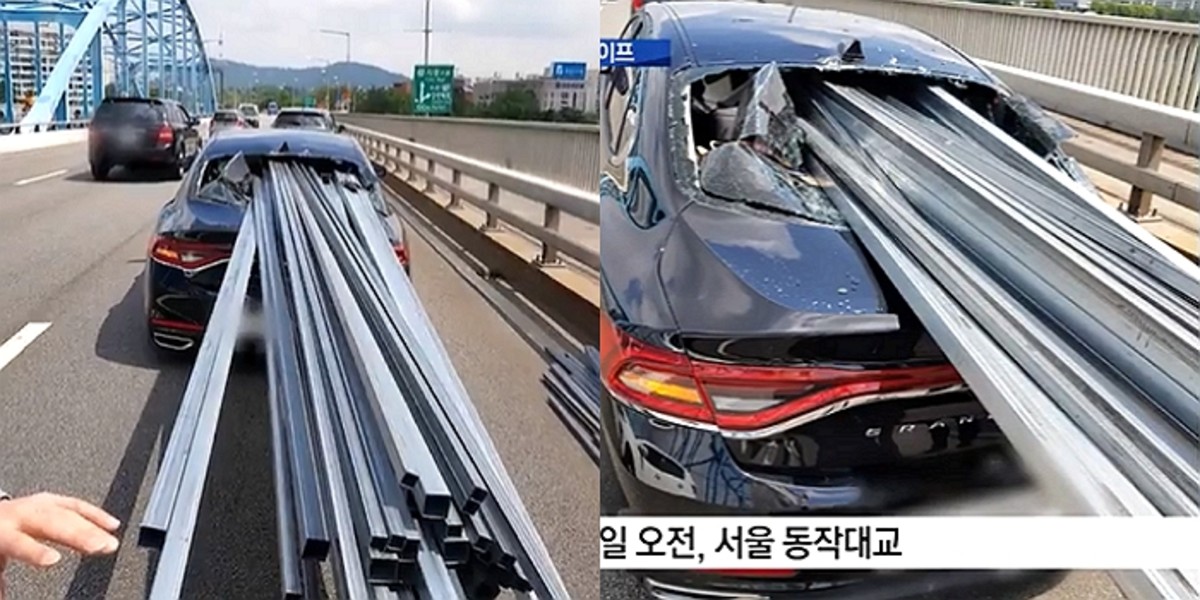급정거 직후 트럭에 실려 있던 쇠파이프들이 바로 앞 차량으로 화살을 쏘듯 날아간 것이다.
