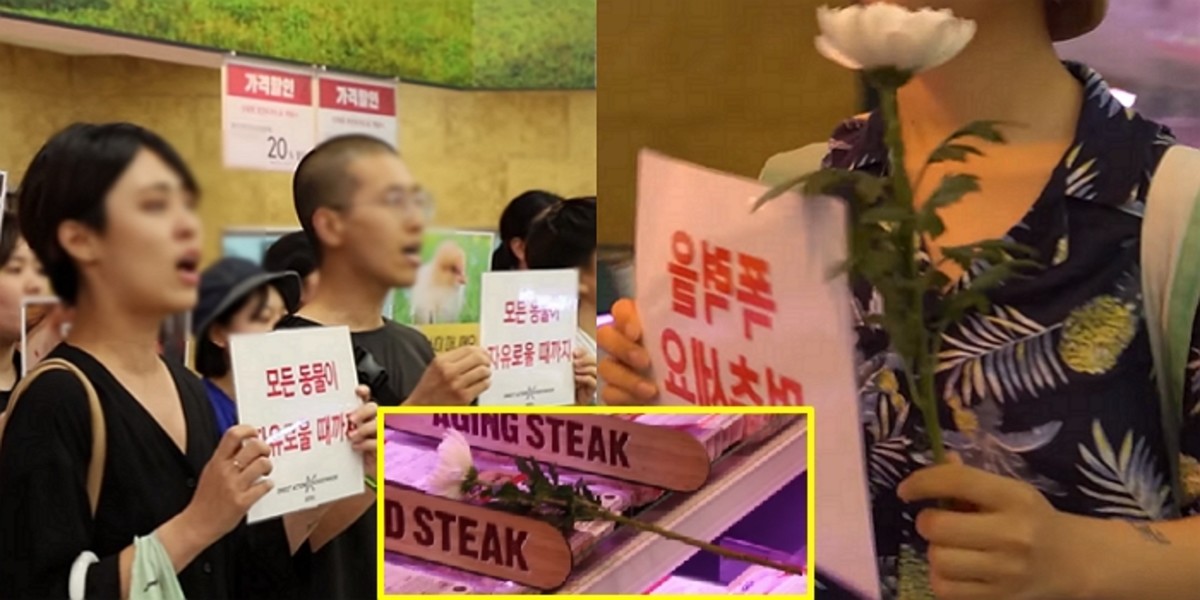 지난 15일 동물권 단체 디엑스이 서울(DxE-Seoul)은 유튜브에 서울의 한 마트에서 시위하는 영상을 올렸다.