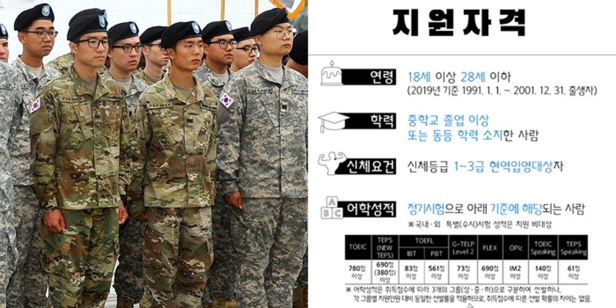 카투사 지원자격은 18세 이상 28세 이하(1991년 1월 1일∼2001년 12월 31일 출생자)의 현역병 입영 대상자 중 일정한 어학 성적을 접수일 기준 2년 이내에 취득한 자이다.