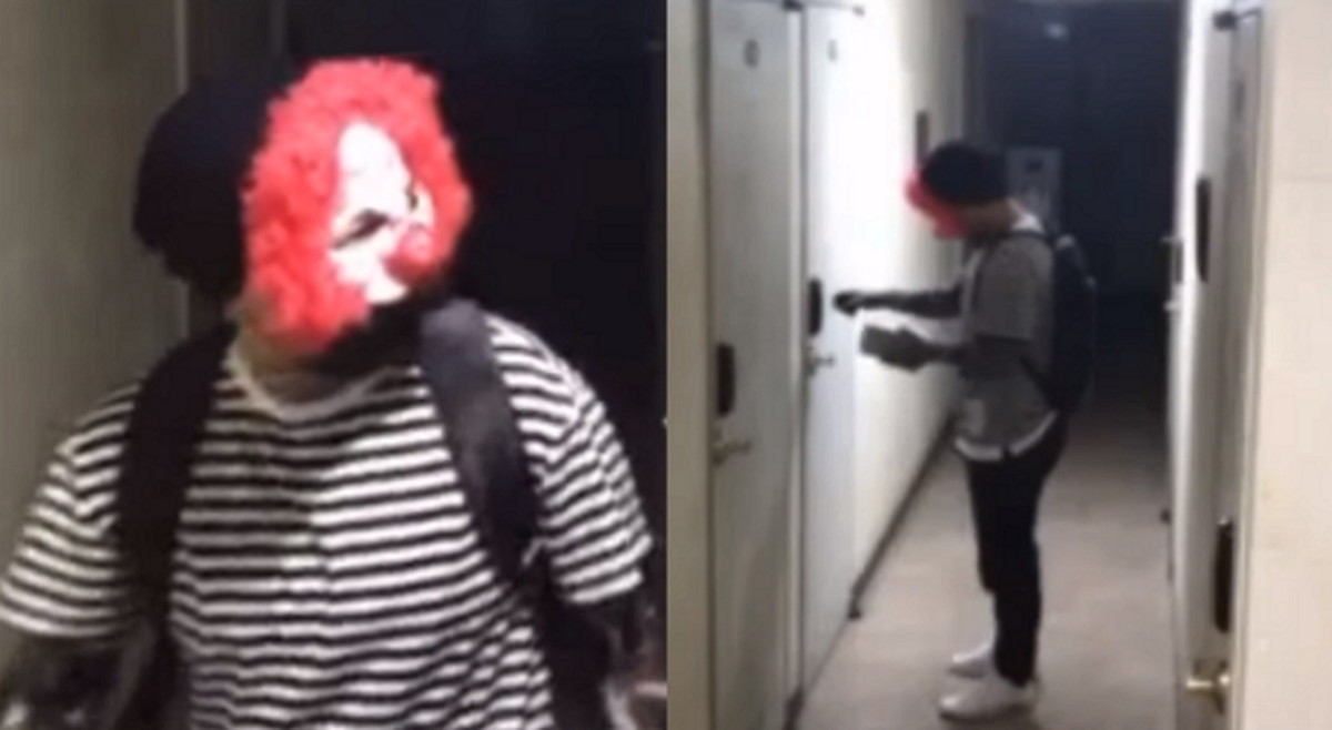 영상을 보면 한 남성이 조심스럽게 주위를 살피며 복도를 서성이고 있다. 신원이 노출되지 않도록 영화 '쏘우' 속 직쏘가 쓴 가면을 착용하고 있다.