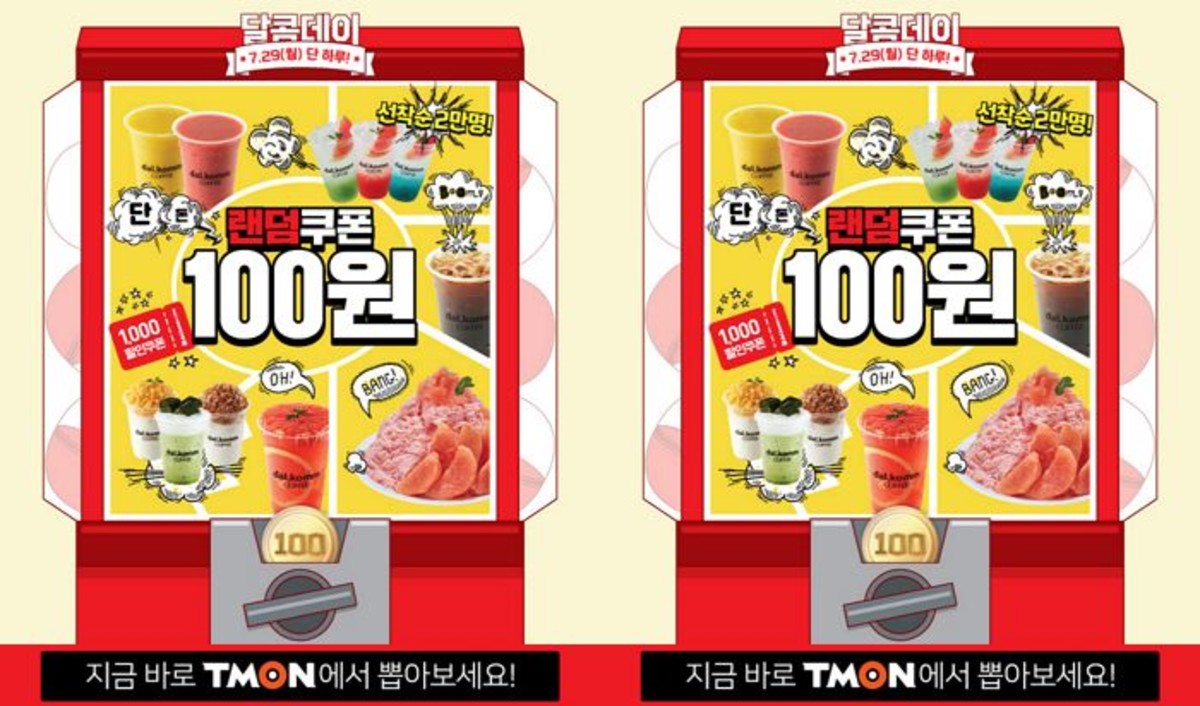 [인사이트] 이하린 기자 = 달콤커피는 티몬과의 협업을 통해 오는 29일 선착순 2만 명이 달콤커피의 여름 인기 메뉴 또는 할인 쿠폰을 단돈 100원에 구매할 수 있는 랜덤쿠폰 이벤트를 실시한다고 26일 밝혔다.