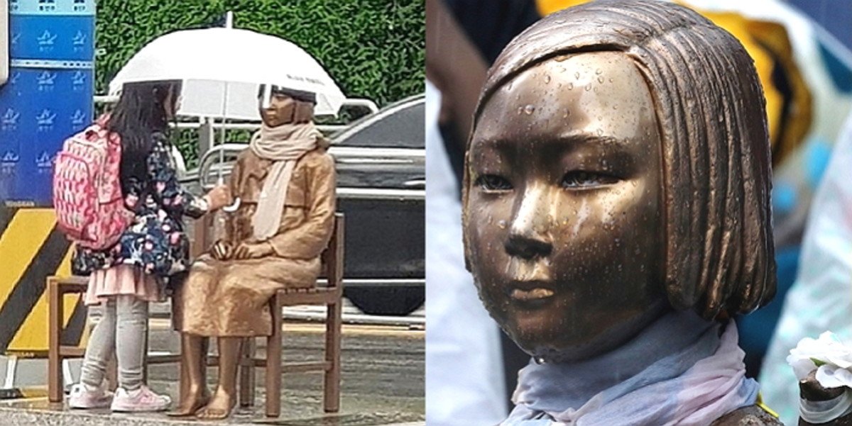 사진에는 초등학생으로 보이는 여자아이가 목도리를 두른 소녀상과 함께 우산을 쓰고 있는 장면이 담겼다.