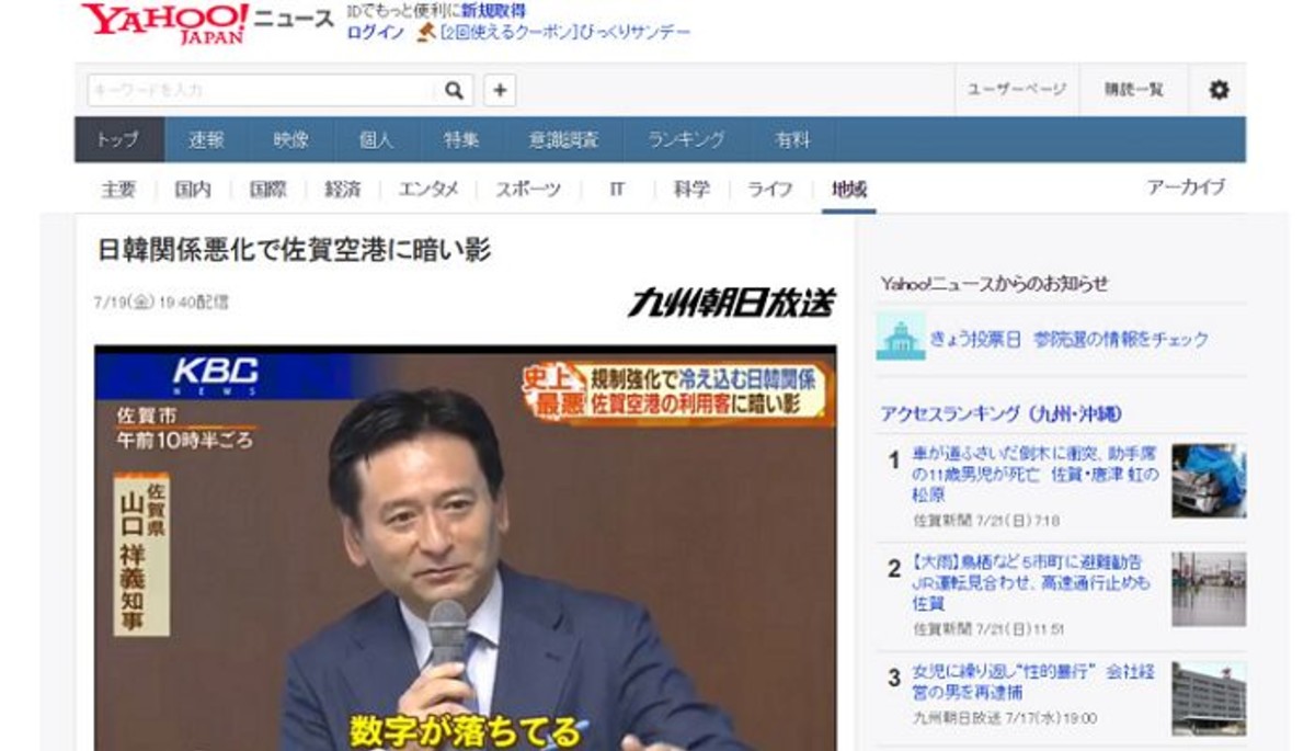 사가현의 야마구치 지사가 한국인 관광객 감소로 인해 현재 힘들다는 회견 관련 언론기사 / 사진 제공 = 서경덕 교수