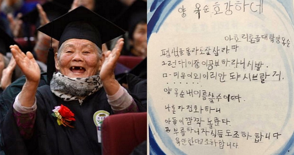 양 할머니와 함께 한글 대학을 졸업한 김영순 할머니는 "이 세상에 나서 너 때문에 제일 기뻤다"라며 시를 써 내려갔다.