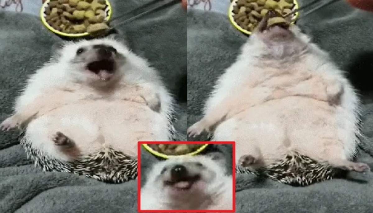 그런데 뒤집힌 자세가 세상 가장 편한 것처럼 행복한 표정 지으며 밥까지 먹는 고슴도치가 포착돼 웃음을 자아낸다.
