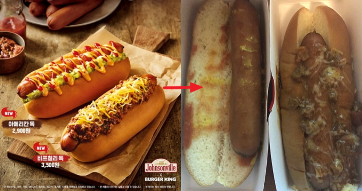 게시물에는 버거킹이 홍보용으로 공개한 핫도그 사진과 글쓴이가 실제 구매한 핫도그 사진이 함께 담겨 있다.