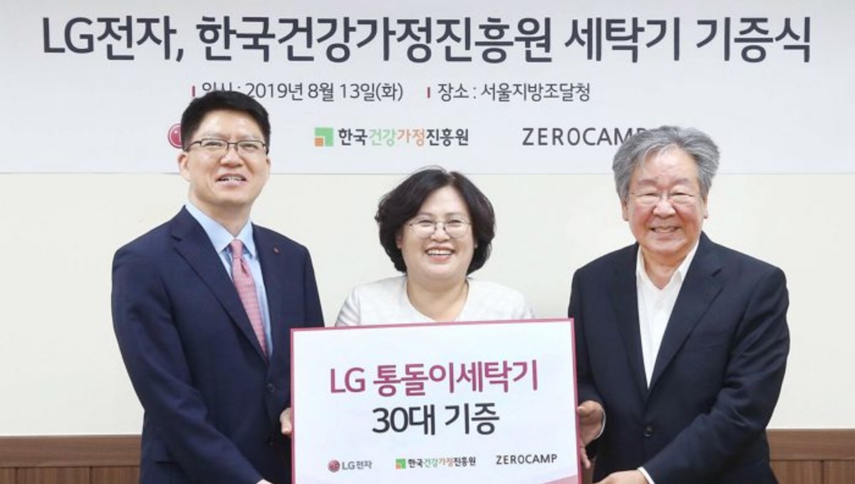 LG전자는 어제(13일) 서울지방조달청 본관 4층에서 한국건강가정진흥원 김혜영 이사장, 박내원 한국HA마케팅담당, 배우 최불암 씨 등이 참석한 가운데 한국건강가정진흥원에 16kg 통돌이세탁기 30대를 기증했다.