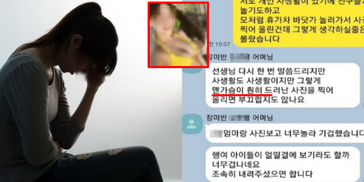 최근 한 온라인 커뮤니티에는 "인스타에 비키니 사진 올렸다가 학부모들에게 욕먹었습니다"라는 제목의 사연 글이 올라왔다.