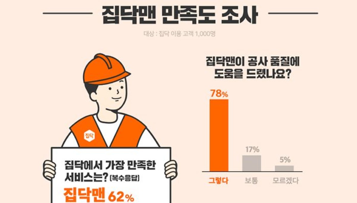 또한, 친절도, 신속성, 전문성 등을 종합해 '집닥맨의 역할이 공사 품질에 도움을 주었나'에 대한 질문에는 '그렇다'가 78%, '보통'이 17%, 5%는 '모르겠다'라고 응답했다.