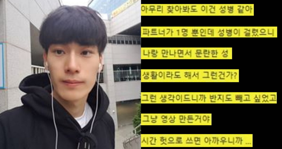 그는 "파트너가 1명뿐인데 성병에 걸렸으니 나랑 만나면서 문란한 성생활이라도 해서 그런 건가? 반지도 빼고 싶고 잠도 안 오고 그냥 영상 만든 거야 시간 허투루 쓰기 아까우니까"라고 밝혔다.