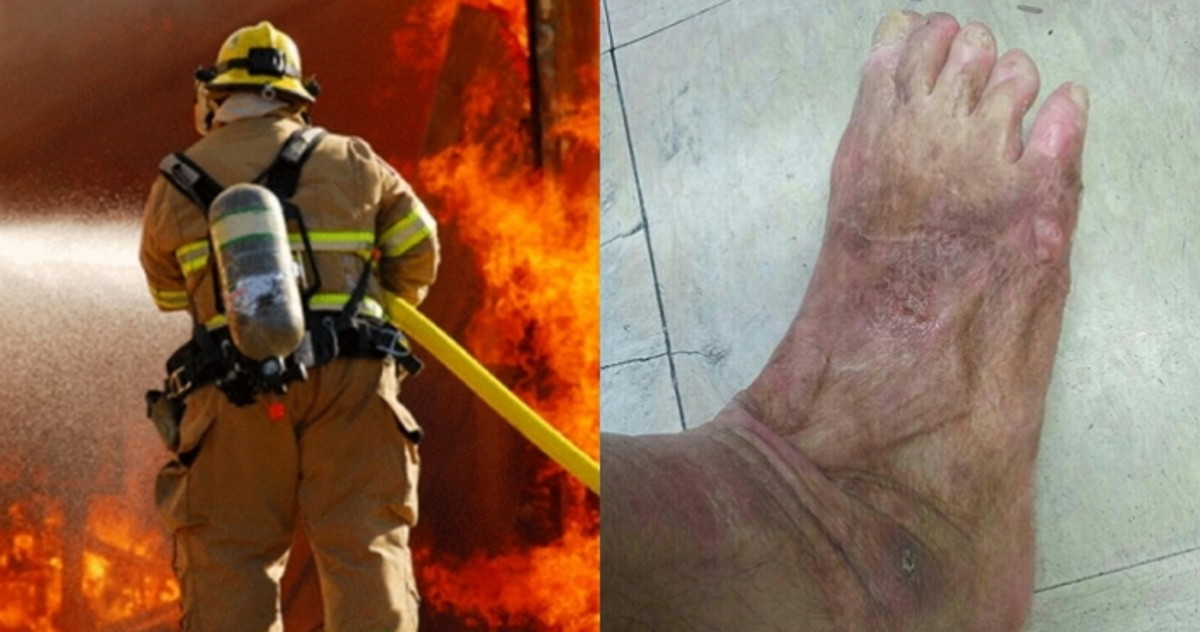 이는 화재 현장에 출동했다가 뜨거운 불길에 녹아 펄펄 끓는 플라스틱 물을 뒤집어쓴 소방관의 발이다.