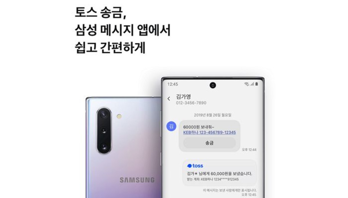 이번 토스와의 제휴를 통해 삼성 메시지 앱에서 쉽고 간편하게 송금할 수 있는 기능이 추가됐으며, 최근 출시된 갤럭시 노트10을 통해 토스 송금을 사용할 수 있다.