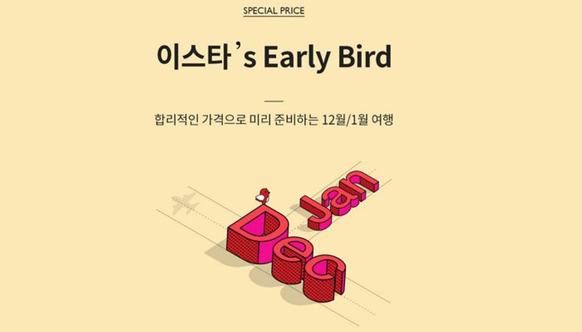 이스타항공 얼리버드 이벤트는 출발 3~4개월 전 항공권을 미리 특가 구매할 수 있는 고정이벤트로 이번 9월 이벤트부터 기존 1일 오픈에서 매월 첫째 주 월요일 오픈으로 변경 운영된다.