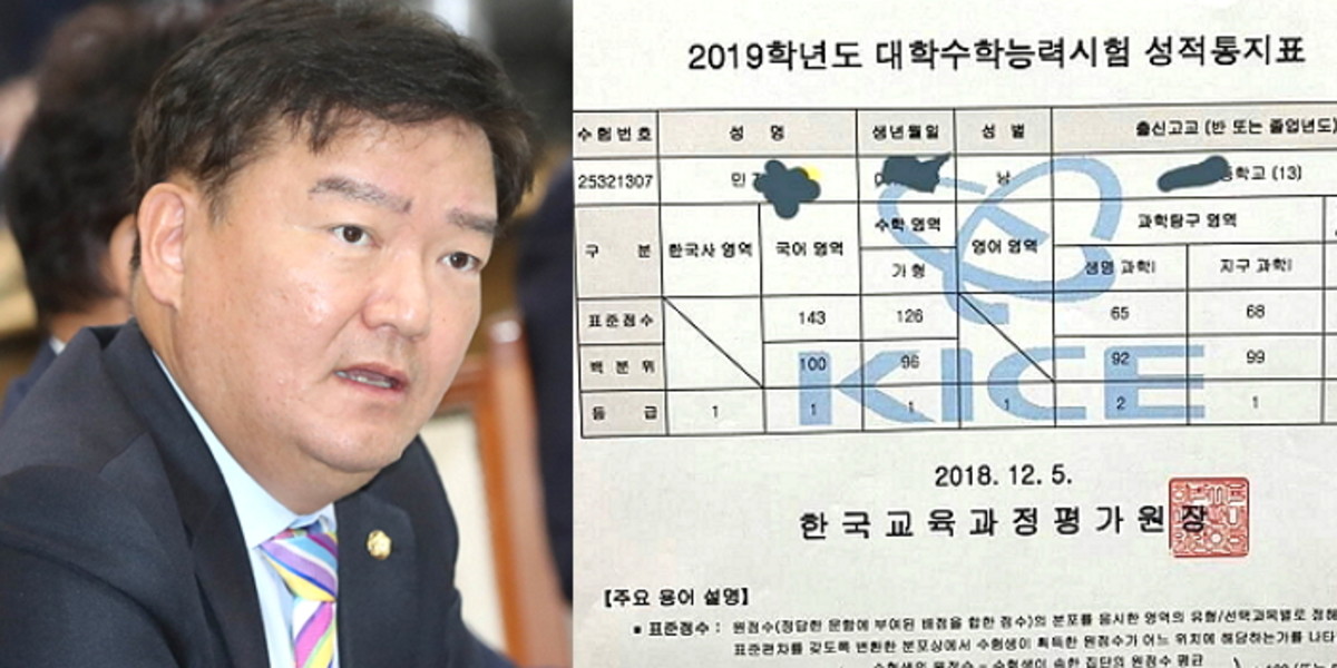 해당 사진에는 민 의원 아들의 2019 대학수학능력시험 성적통지표와 고교 수능 성적 표준점수 집계표가 담겼다.