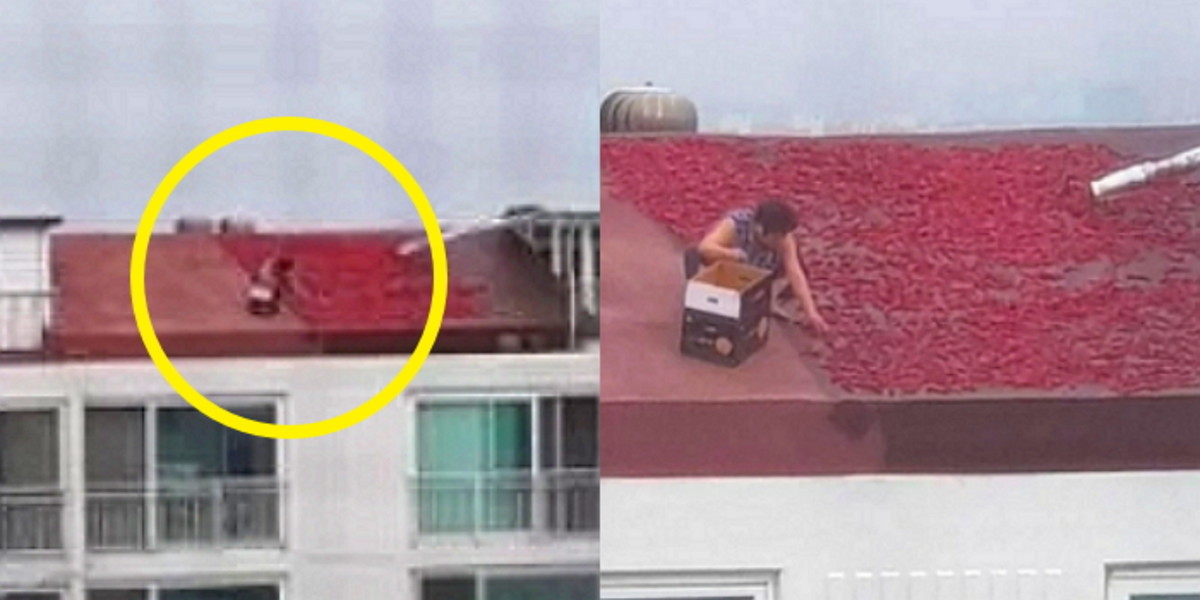 8일 온라인 커뮤니티에는 한 여성이 아파트 옥상에서 고추를 말리는 모습이 포착된 사진이 올라왔다.