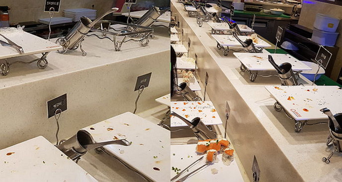 그런데 오랜 시간 기다려 입성한 쿠우쿠우에는 신선한 초밥 대신 텅 빈 진열대만 가득해 여기저기서 항의가 터져 나왔다