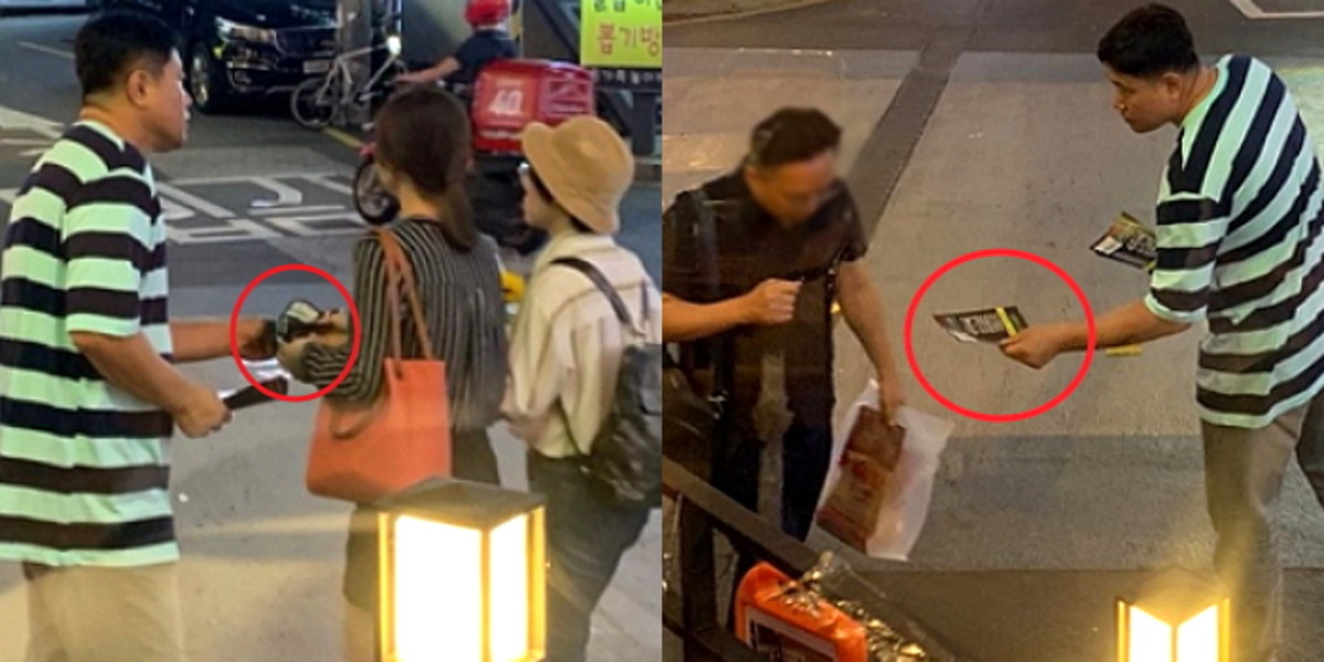 해당 사진 속 양준혁은 길을 걷는 행인들에게 전단지를 나눠주고 있다. 그러나 행인들의 반응은 긍정적이지 않은 듯하다.