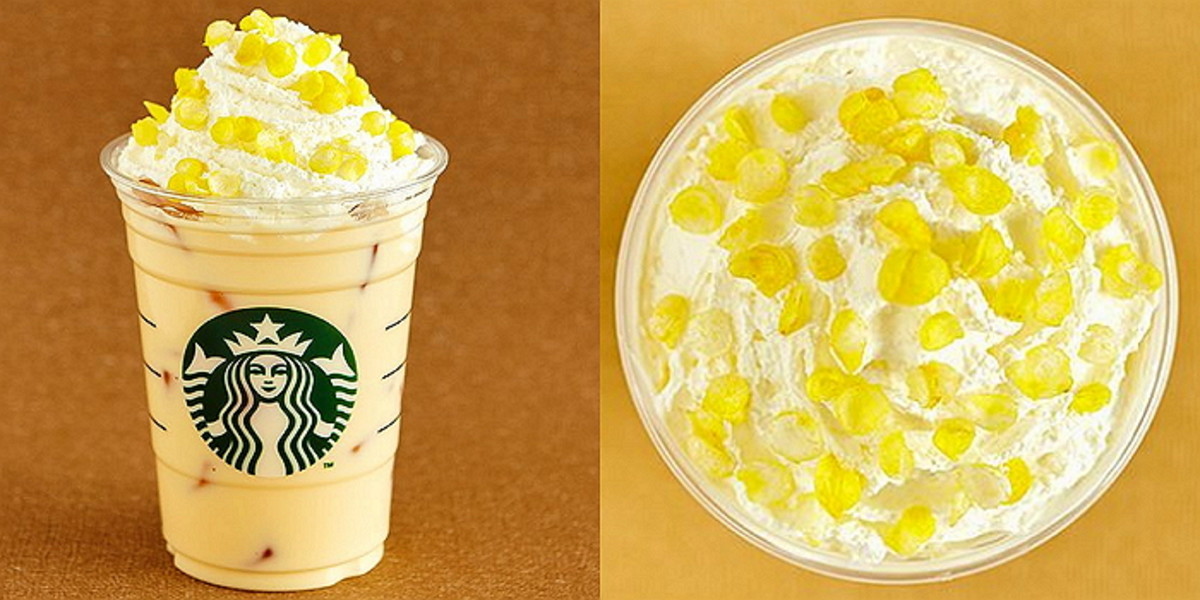 음료에는 부드럽고 달콤한 호박 군고구마가 기본 베이스로 들어간다. 여기에 노란색의 먹음직스러운 라이스 토핑이 올라간다.