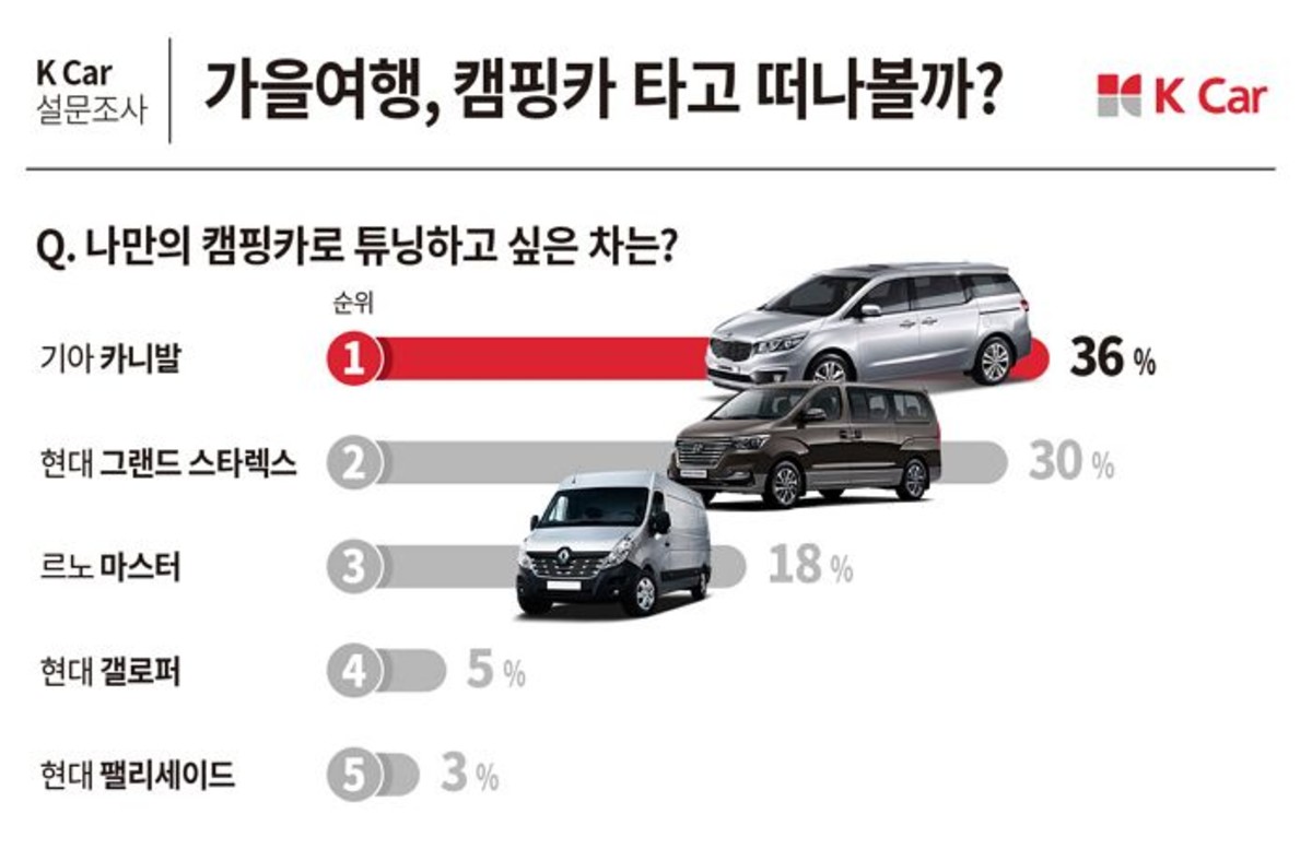 [인사이트] 석태진 기자 = 케이카(K Car)는 여행가기 좋은 계절 가을을 맞아 '캠핑카로 떠나는 가을여행'을 주제로 성인남녀 284명을 대상으로 설문조사를 실시한 결과, '캠핑카로 튜닝하고 싶은 차' 1위에 기아 카니발이 꼽혔다고 밝혔다.