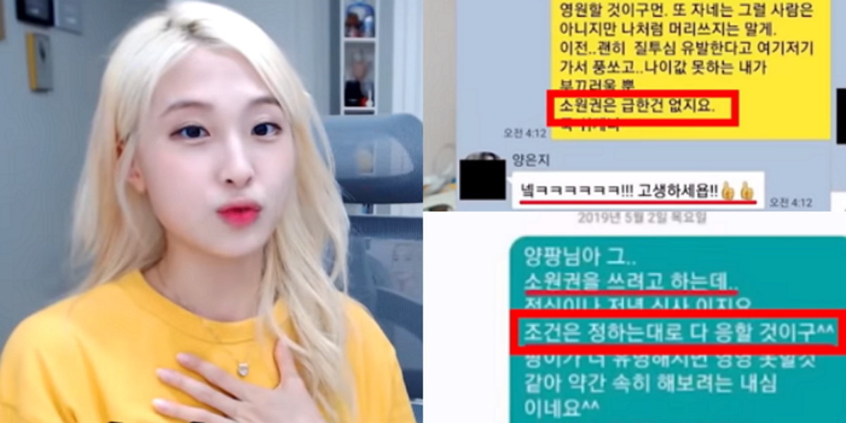 또한 A씨는 "소원권 쓰려고 한다", "조건은 정하는 대로 다 응하겠다"라며 양팡의 해명과 달리 사적인 만남이 아니라 방송을 켜고 만나도 된다는 의사를 표현했었다.