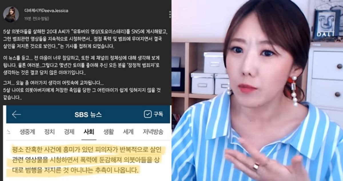 디바 제시카가 캡처한 기사는 5살 의붓아들을 때려 숨지게 한 20대 계부 이야기로, 해당 내용에는 계부가 자신의 SNS에 꾸준히 살인 사건을 다룬 영상을 게재했다는 설명이 적혀있었다.