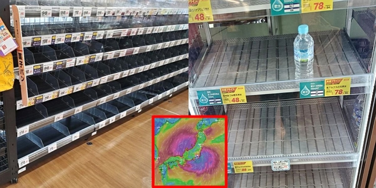 사진에는 생필품이 전량 매진된 진열대가 나와 있다. 식료품부터 식수, 심지어 음료수나 과자까지 매진돼 있었다.