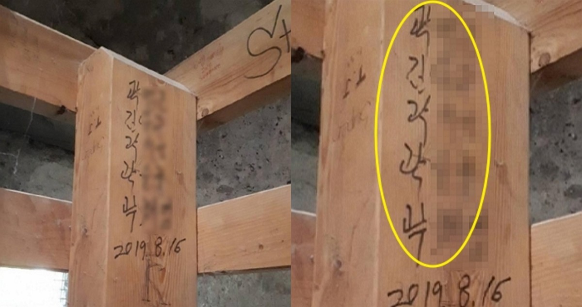공개된 사진 속 나무 난간에는 "곽XX, 김XX, 곽XX, 곽XX, 곽XX. 2019.8.16"이라고 적혀 있다.