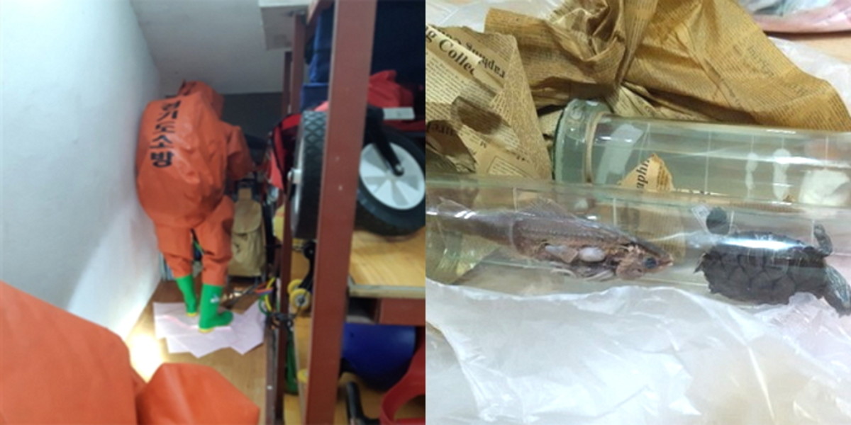 소방당국과 경찰은 유치원 지하 기자재 창고에 보관 중이던 포르말린이 든 동물 액침표본 2개가 깨져 있는 것을 확인하고 현재 관계자 등을 상대로 조사를 벌이고 있다.