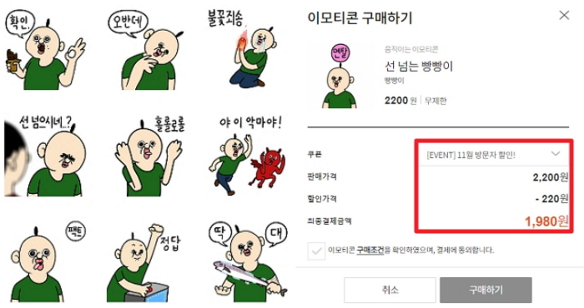 4일 카카오톡 이모티콘샵에 따르면 카카오는 11월 한 달 동안 웹 이모티콘샵과 카톡 PC 버전에서 사용 가능한 이모티콘 10% 할인 쿠폰을 제공한다.