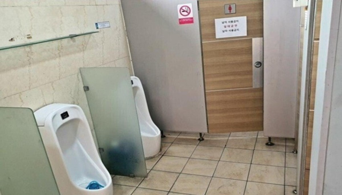 공개된 사진 속에는 남성용 소변기를 지나쳐야 여성용 칸을 들어갈 수 있는 형태의 남녀 공용 화장실 모습이 담겨있다.
