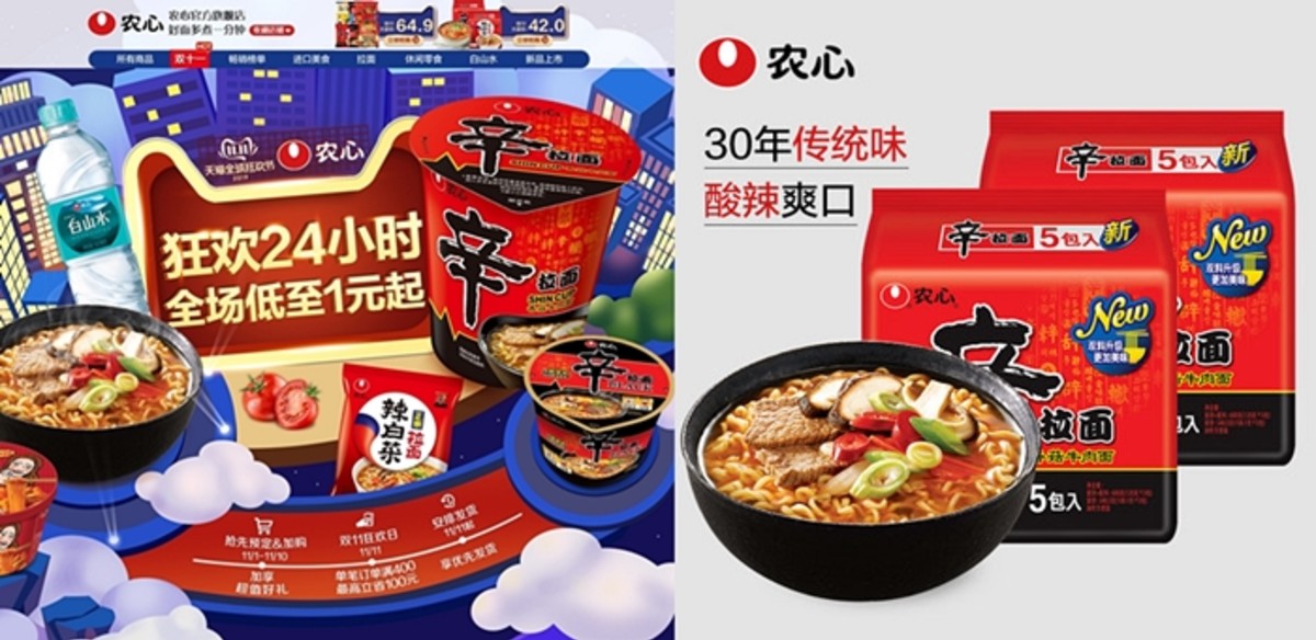 농심은 지난 11일 광군제 하루 동안 온라인에서 700만 위안(약 11억 6천만원)의 매출을 기록했다. 이는 지난해 광군제 매출 500만 위안 대비 40% 성장한 수치다.