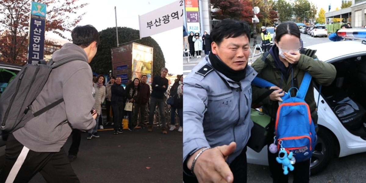수능을 치르는 수험생들과 이들을 응원하는 선, 후배 및 교사, 학부모들로 가득했던 수험장 입구에서 스포트라이트를 받은 건 올해도 역시나 '지각생'들이었다.