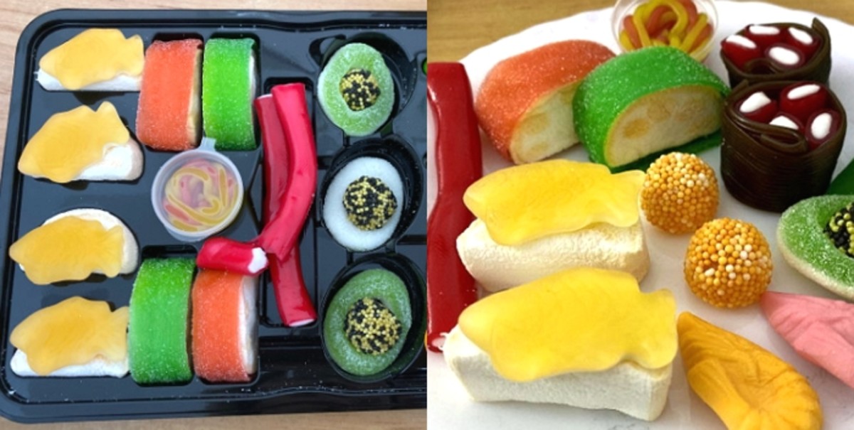 검은색의 얇고 평평한 젤리는 다른 사탕들을 감싸 '김' 역할을 하며 군함 스시를 연상시키는 비주얼을 만들어냈다.