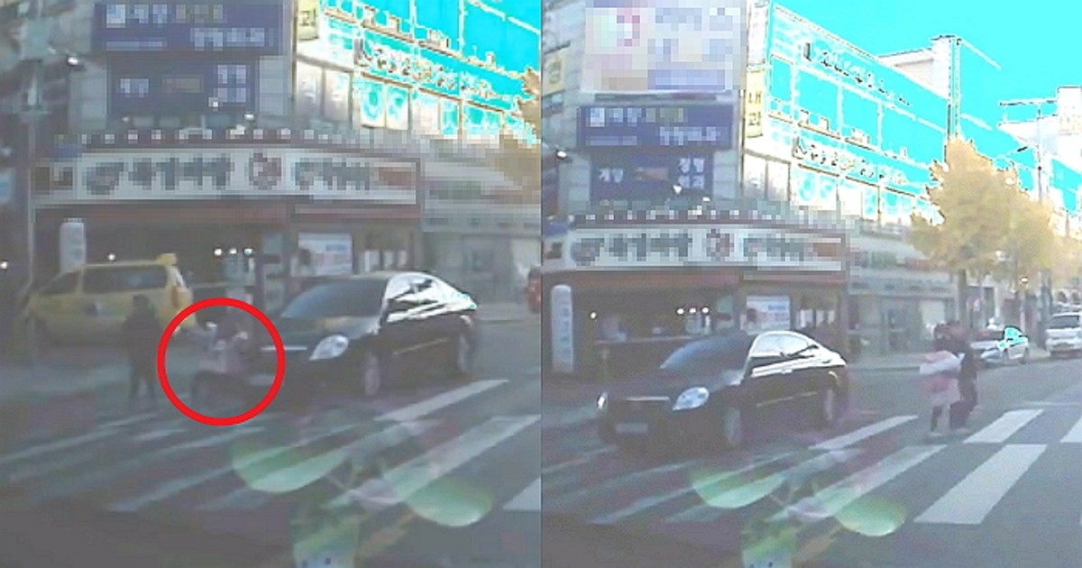 그곳에서는 초등학교 1~2학년쯤 되어 보이는 어린아이가 횡단보도에 있는 차 앞에서 일어나고 있었다.