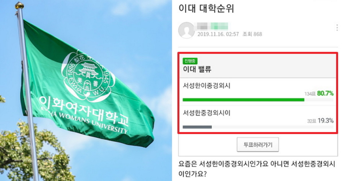 최근 입시 전문 커뮤니티 '수만휘(수능날만점시험지를휘날리자)'에서는 이대의 대학 순위를 묻는 설문 조사가 이뤄졌다.