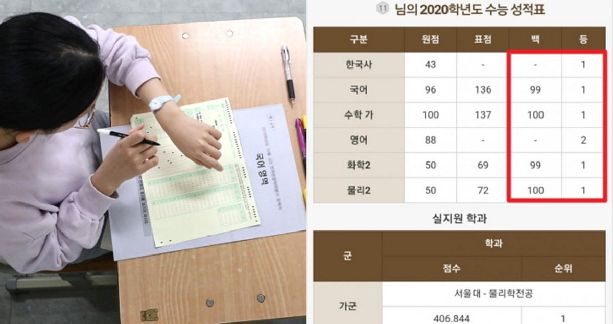 절대평가인 영어 한 과목만 2등급. 나머지 과목은 모두 1등급일 뿐만 아니라 상대평가가 적용된 국어, 수학, 화학2, 물리2 각각 백분율 99%, 100%, 99%, 100%였다.