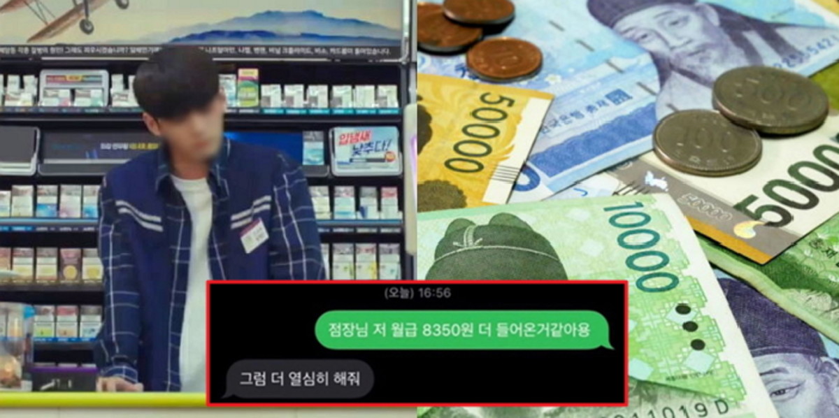 문자 내용을 살펴보면 알바생이 먼저 "점장님 저 월급 8350원 더 들어온 거 같아요"라고 보냈다.