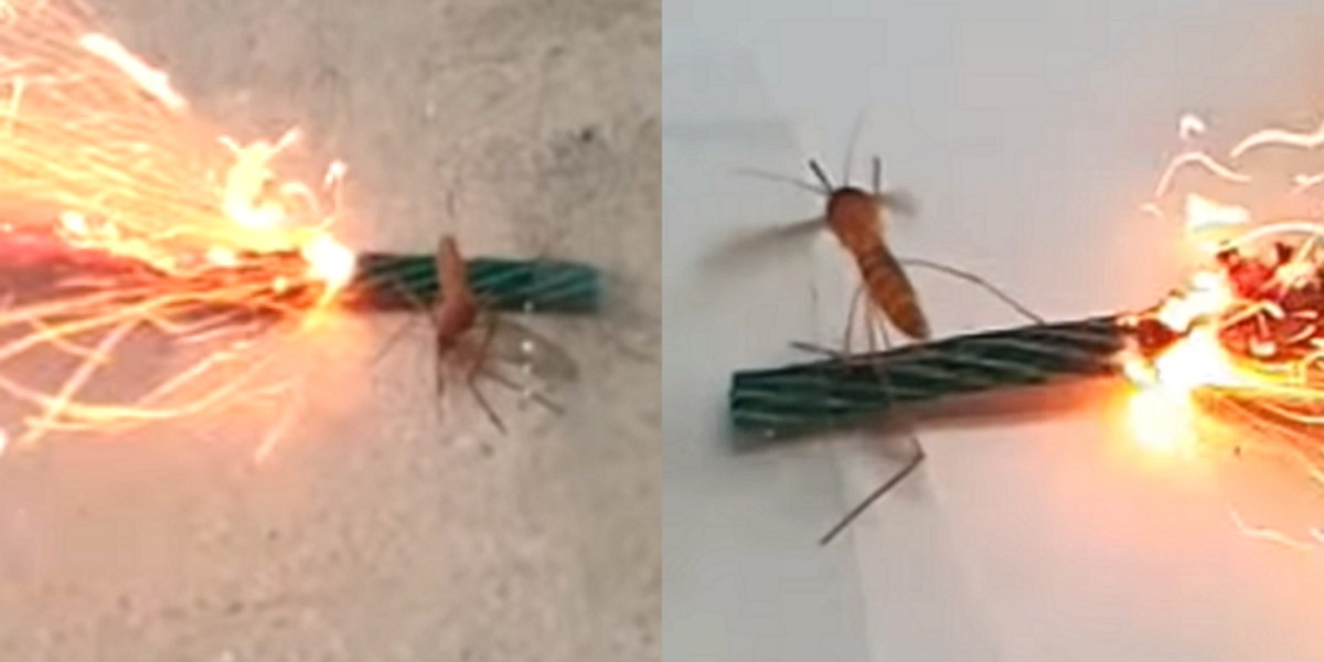 해당 영상은 회색 막대에 테이프로 모기를 고정한 장면으로 시작했다. 회색 막대는 다름 아닌 불꽃놀이용 폭죽이었다.