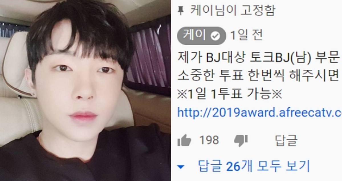 지난 25일 자신의 유튜브 채널 '케이'에 올린 "방송 인생 8년 만에 찾아온 위기"라는 제목의 영상 아래 투표를 독려하는 댓글을 남긴 것이다.