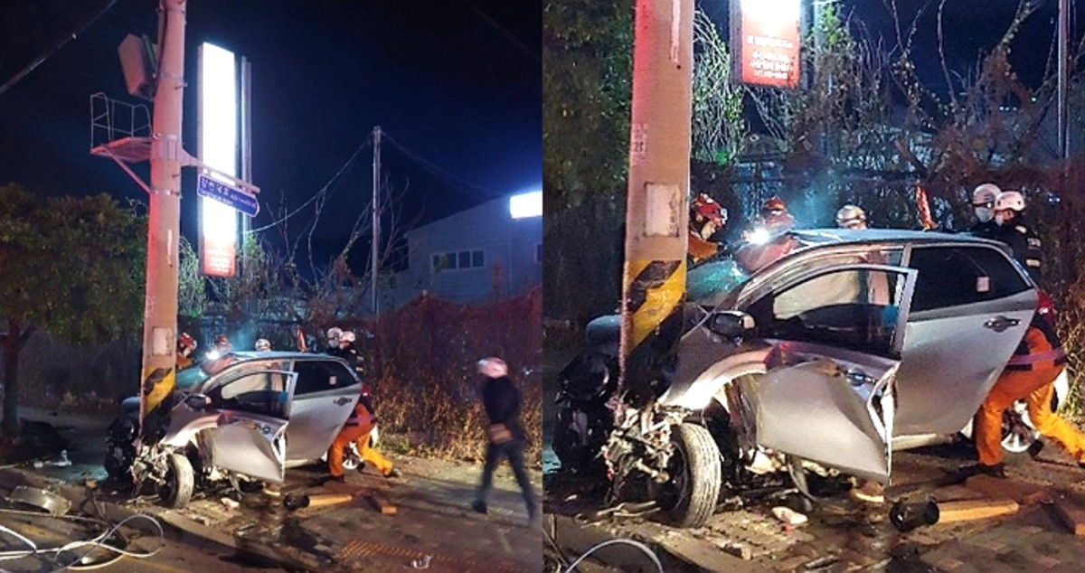 27일 부산소방재난본부와 부산 사상경찰서에 따르면 전날 오후 10시 50분께 부산 사상구 엄궁동 강변도로에서 구포 방면으로 달리던 승용차가 길가 전신주를 들이받았다.