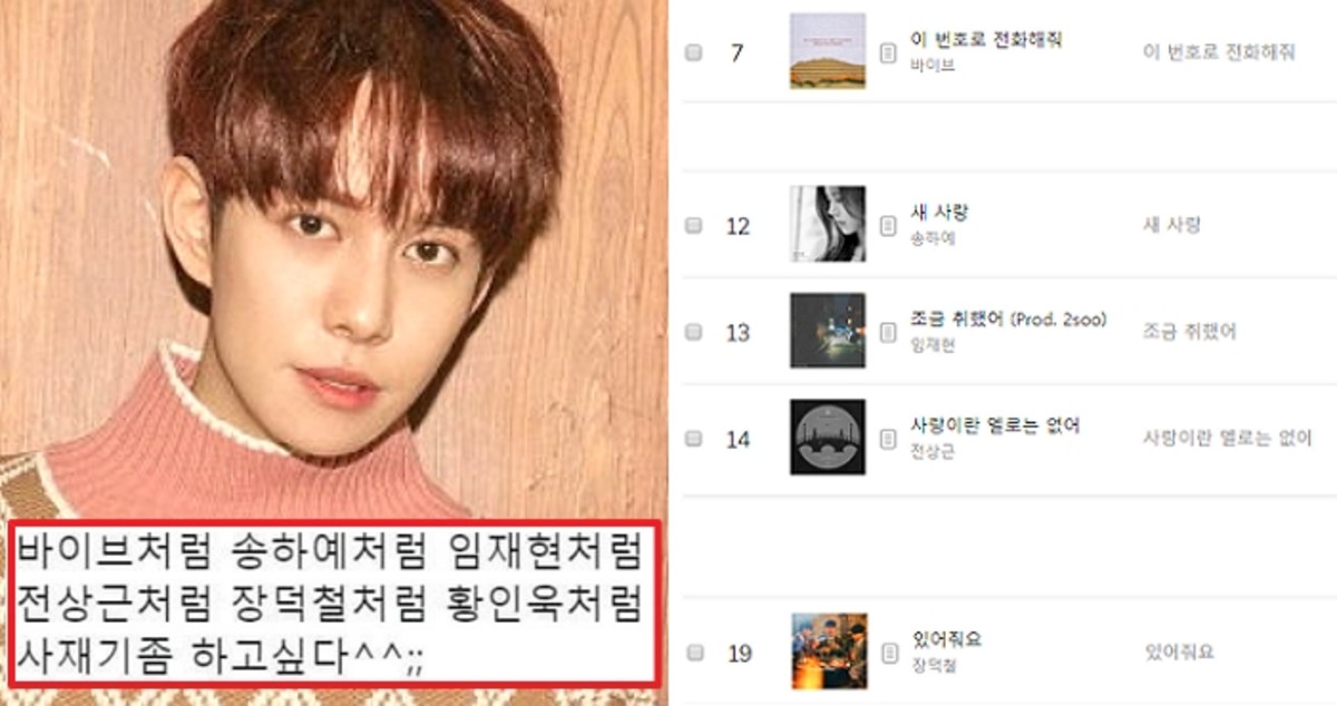 한편 이번 사재기 논란은 지난 24일 블락비 멤버 박경이 자신의 트위터 계정에 "바이브처럼 송하예처럼 임재현처럼 전상근처럼 장덕철처럼 황인욱처럼 사재기 좀 하고 싶다"라는 글을 게재하며 수면 위로 떠올랐다.