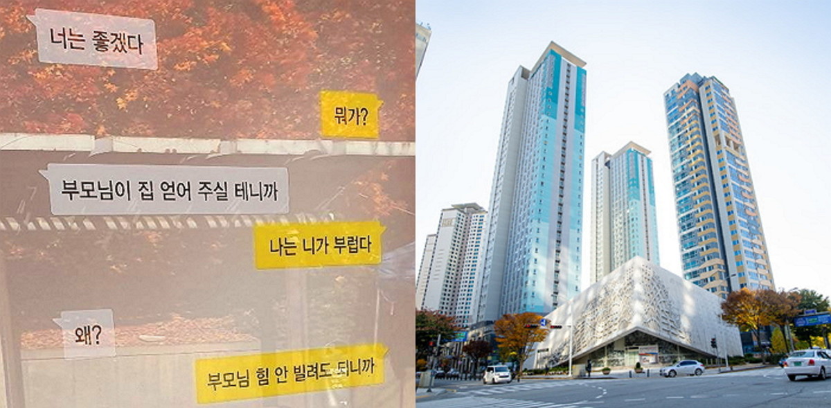 내용은 간단하다. '금수저' 친구가 흙수저 친구를 '오히려' 부러워하는 내용이다. 부모님의 도움을 받아 집을 마련할 수 있는 친구가 부모님의 도움을 받지 못하는 친구에게 "너가 부럽다"고 하는 문구가 담겨 있다.