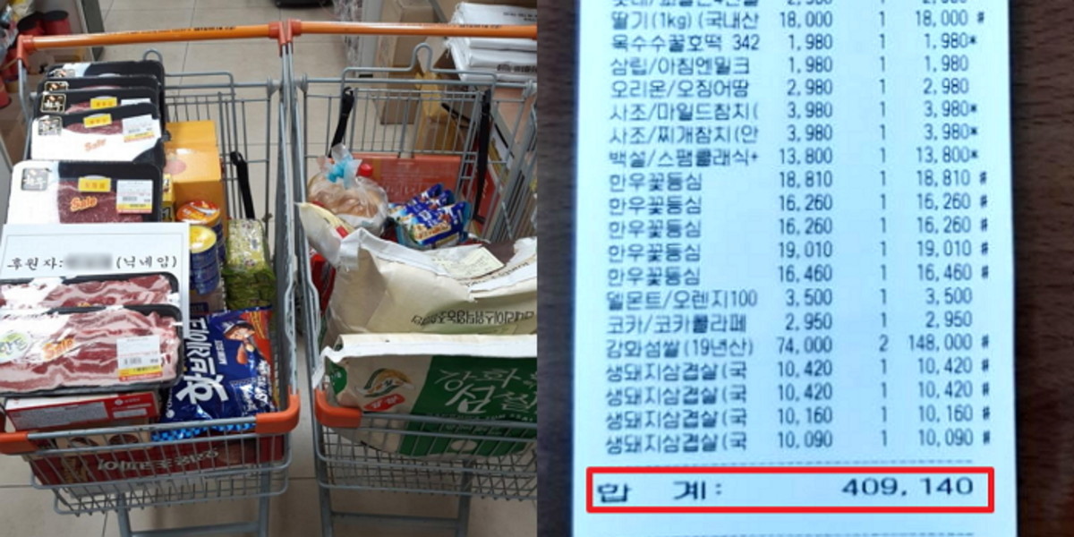 공개된 사진 속에는 여러 음식으로 가득 채워진 카트 두 개가 있었다. 카트는 다양한 음식으로 채워졌는데 한우 꽃등심부터 삼겹살, 라면, 쌀, 음료 등 상상만으로도 입맛을 자극하는 것들이었다.
