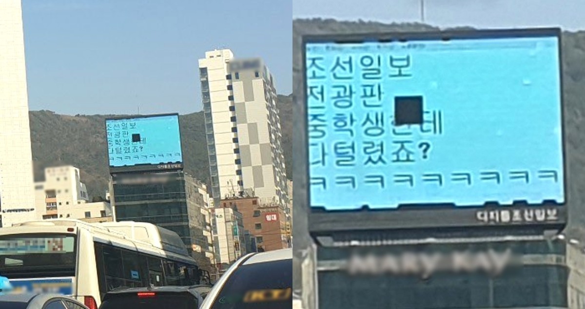 이날 전광판에는 PC 워드 프로그램으로 보이는 배경에 '조선일보 전광판 중학생한테 다 털렸죠?ㅋㅋㅋㅋ'라는 문구가 노출됐다.