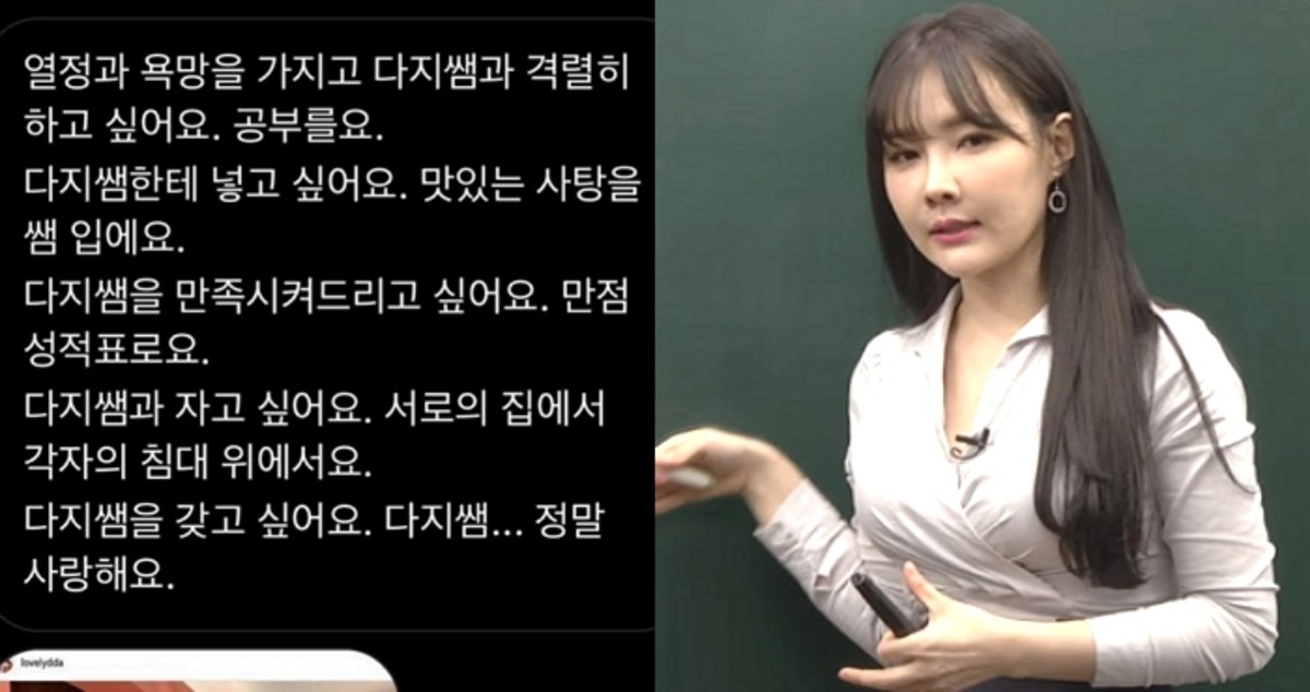 [인사이트] 함철민 기자 = 메가스터디에서 한국사와 동아시아사 등 역사를 가르치고 있는 강사 이다지가 한 학생으로부터 받은 성희롱 메시지를 폭로했다.
