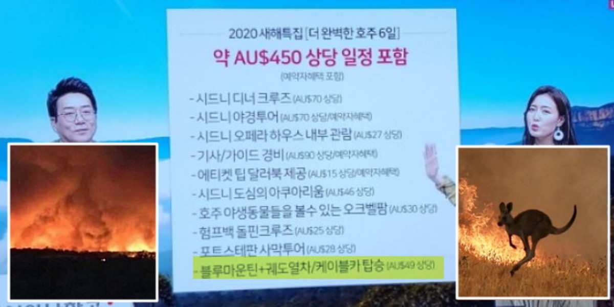 한 누리꾼은 "홈쇼핑에서 소개하는 블루 마운틴은 지금 불타고 있는데 그곳에서 케이블카를 타라고 하는 게 말이 되냐"고 꼬집었다.