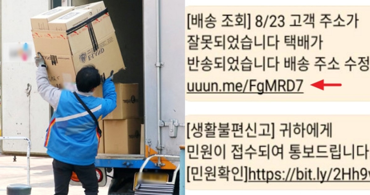 만약 "고객 주소가 잘못되었습니다. 택배가 반송되었습니다. 배송 주소 수정", "귀하에게 민원이 접수되어 통보 드립니다"와 같은 문자메시지가 온다면 스미싱을 의심해야 한다.